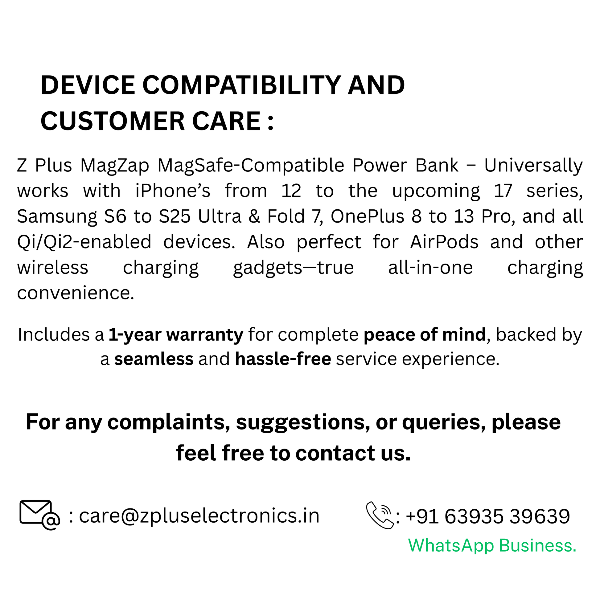 - ✅ Universal Compatibility – Works with iPhone, Samsung, OnePlus, Vivo, Oppo, Motorola, iPad, MacBook (low power), AirPods, and more.
