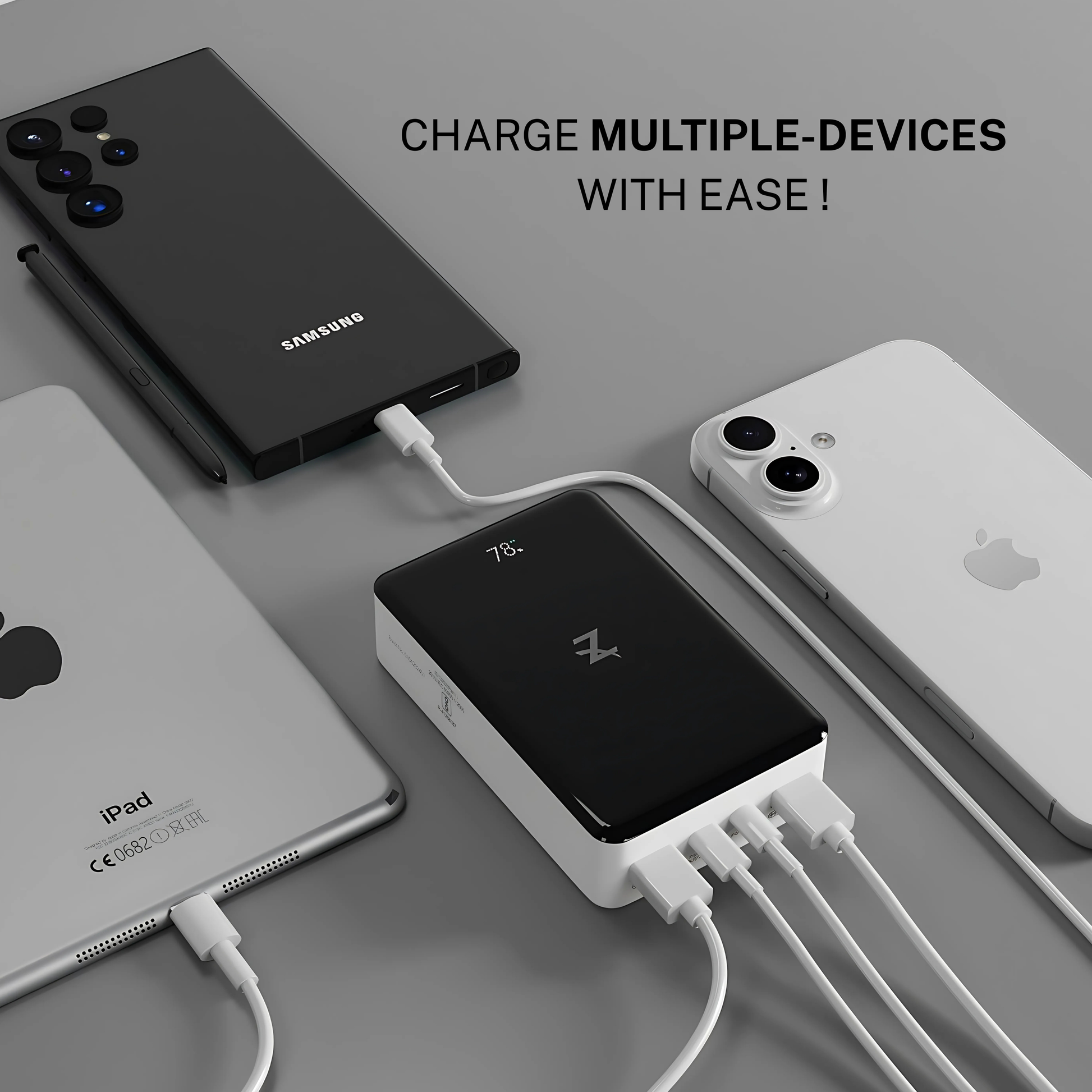 - 🔌 4 High-Speed Charging Ports – 1×USB-A (18W QC 3.0), 1×USB-A (22.5W Super Charge for Vivo/Oppo/OnePlus/Motorola), 1×USB-C (20W PD in/out), 1×Lightning input.